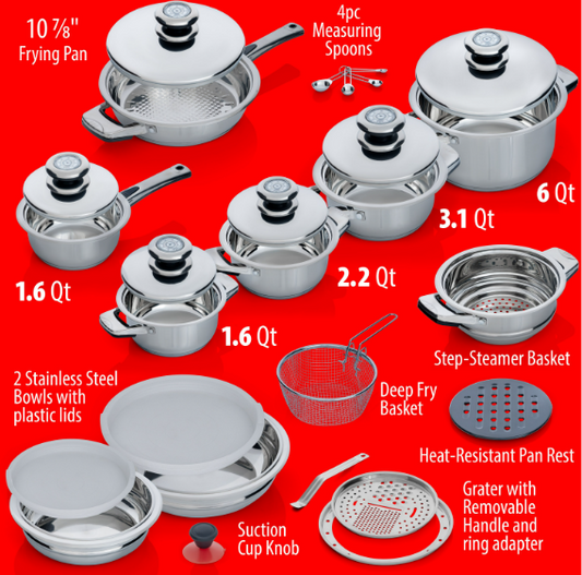Chef's Secret 28-Piece Cookware Set - 12-Element Heavy-Gauge Stainless Steel Waterless Cookware - Kitchen Pots And Pans, Steamer, Broiler For Cooking, Frying - Home Essentials & Gifts For Cooks, Chefs KT28