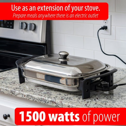 Precise Heat 16-Inch Electric Skillet - Rectangular Stainless Steel Pan with Handles and Lid Cover KTES4