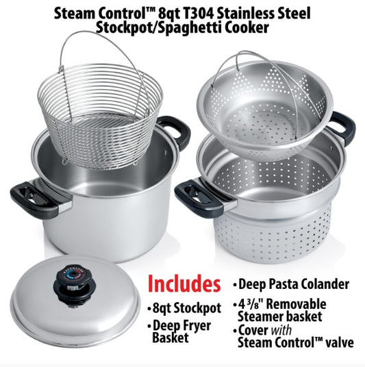 Chef's Secret 8 Quart T304 Stainless Steel Stockpot/Spaghetti Cooker with Deep Fry Basket & Steamer Inserts KT82